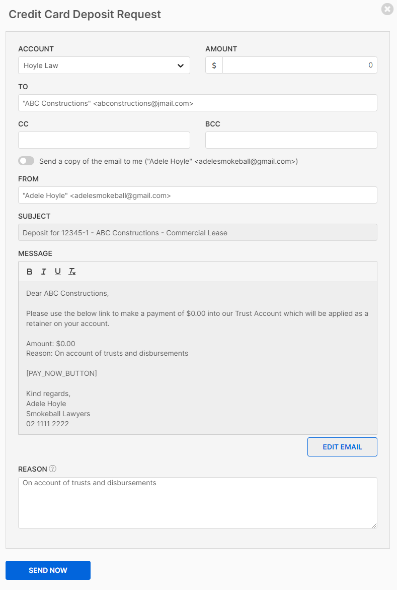 - Select the trust account to be used and enter the amount to request from the client. You can also review the email that will be sent to the client and make changes to it if necessary.