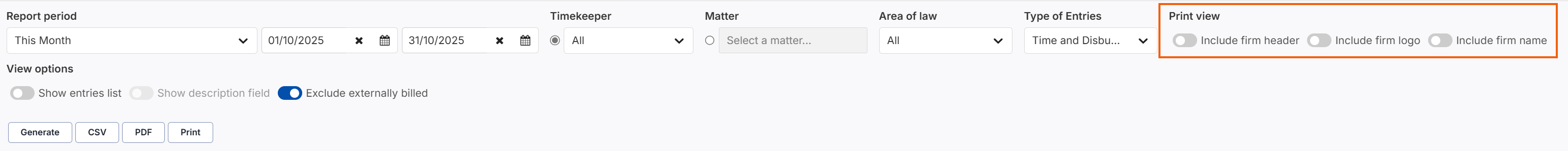 - The Type of Entries filter lets you choose between Time and Disbursements, Time only, or Disbursement only.