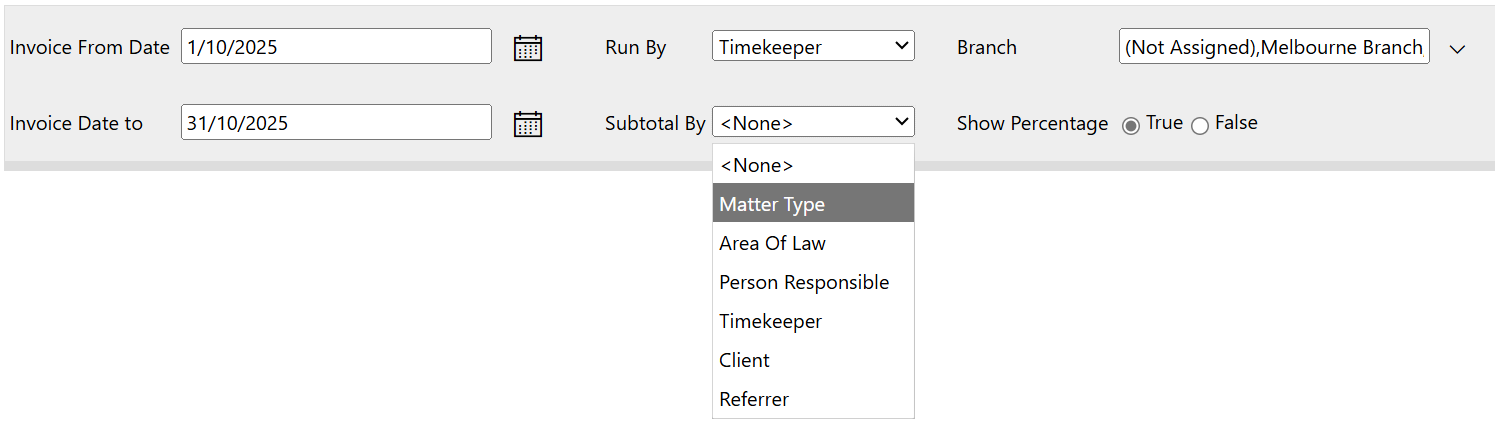 - The report will not be split up into rows based on the selection made using the Subtotal By filter if <None> is selected.