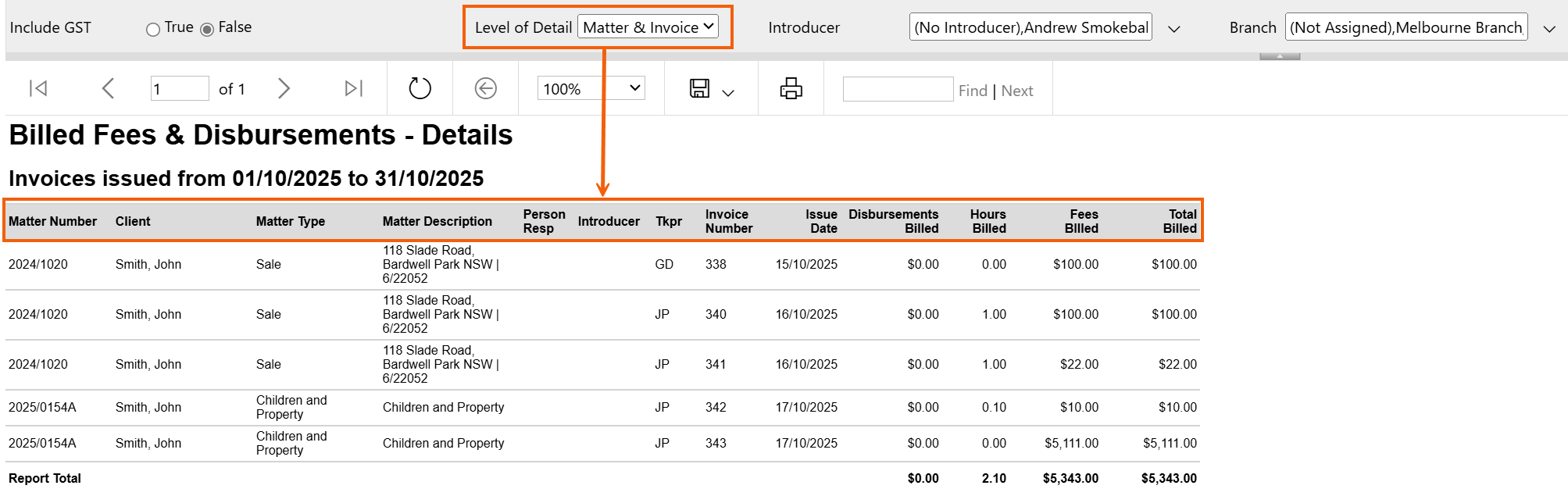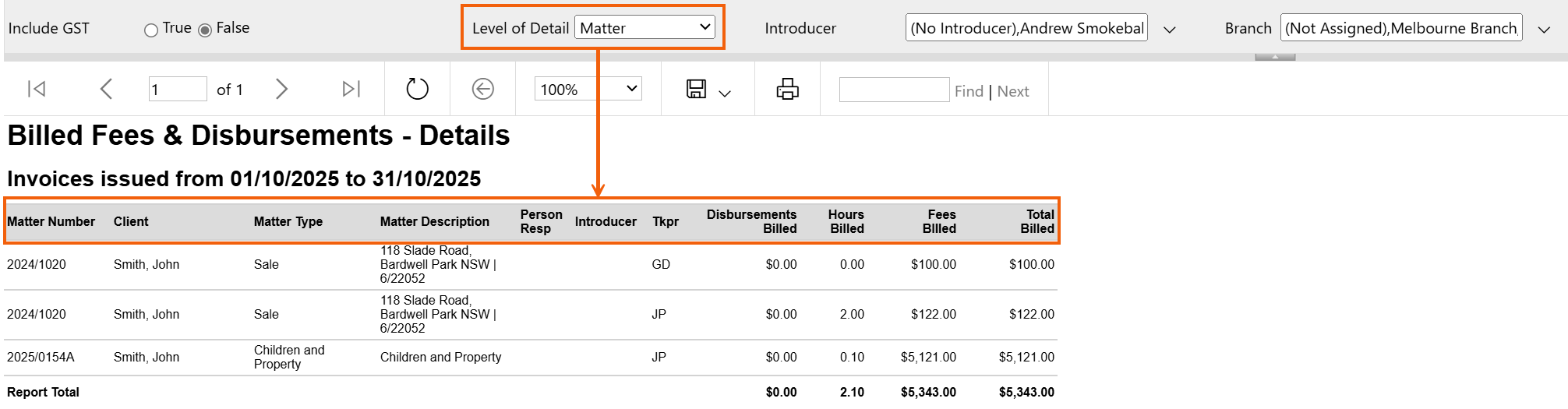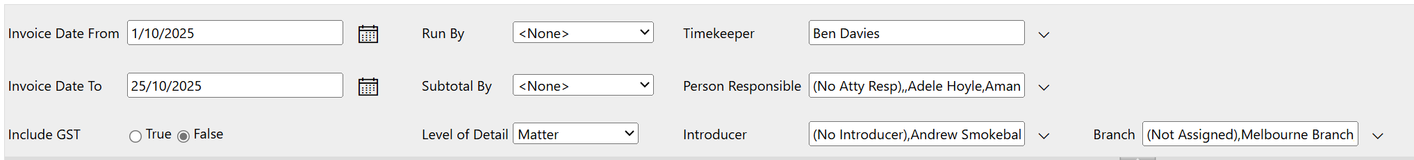 Use the Billed Fees & Disbursements Report to gain valuable insights into amounts billed and staff / overall firm performance for a particular billing period. Based on your area of interest, the report allows for grouping of information by either the areas of law, matter types, clients, timekeepers, referrers, introducers or persons responsible.Â