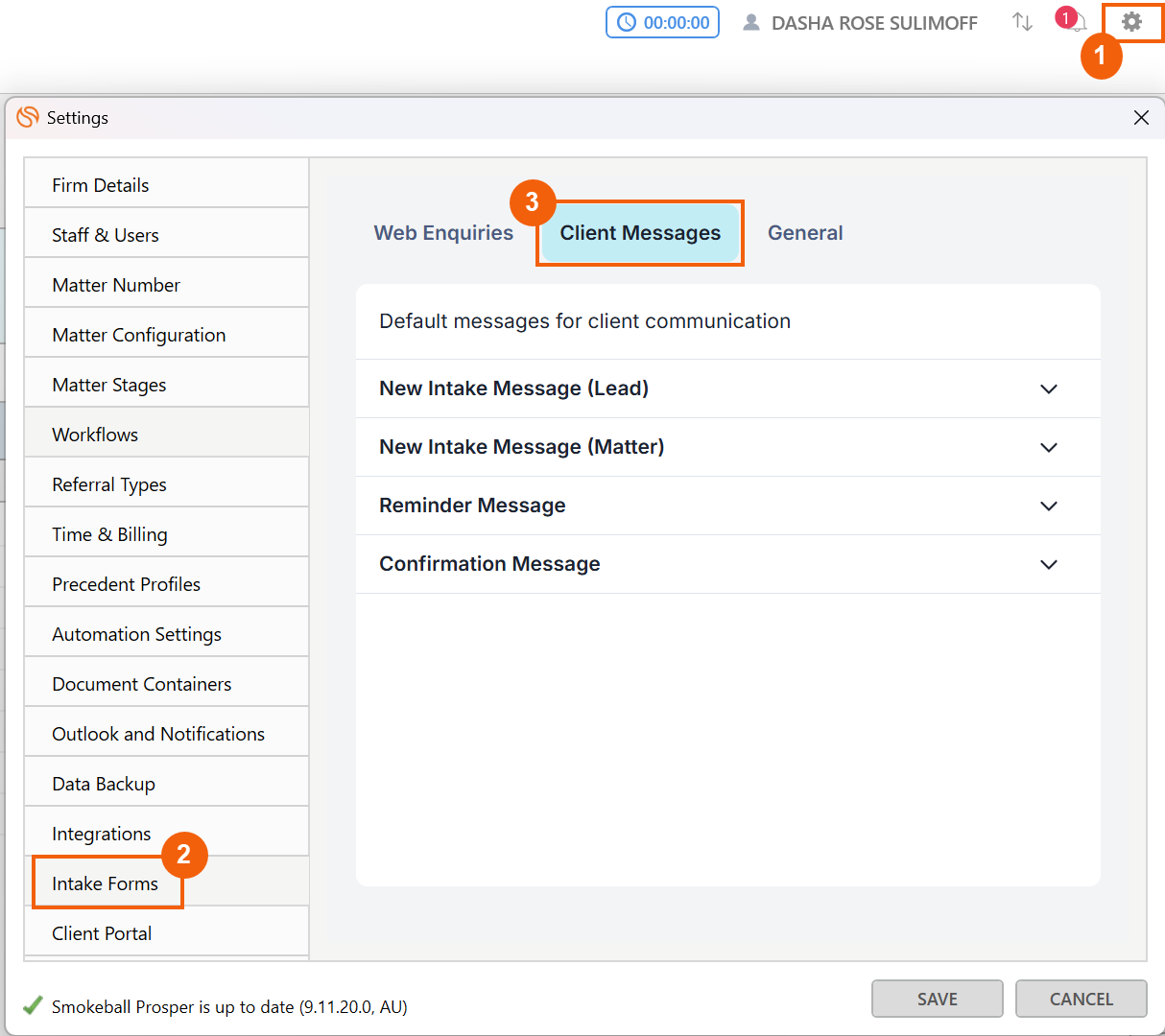 - Select the Settings (gear) icon to access Smokeball Settings.