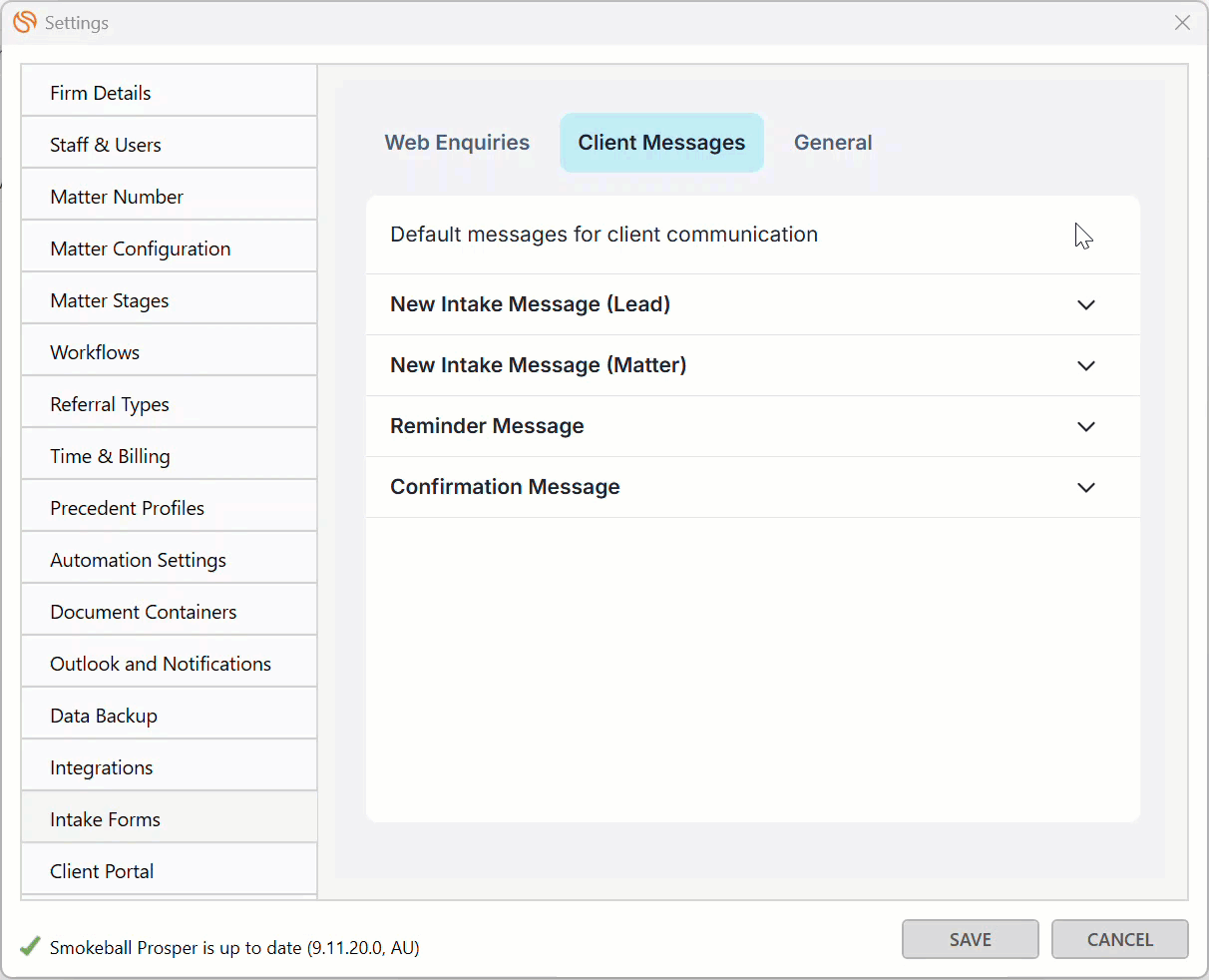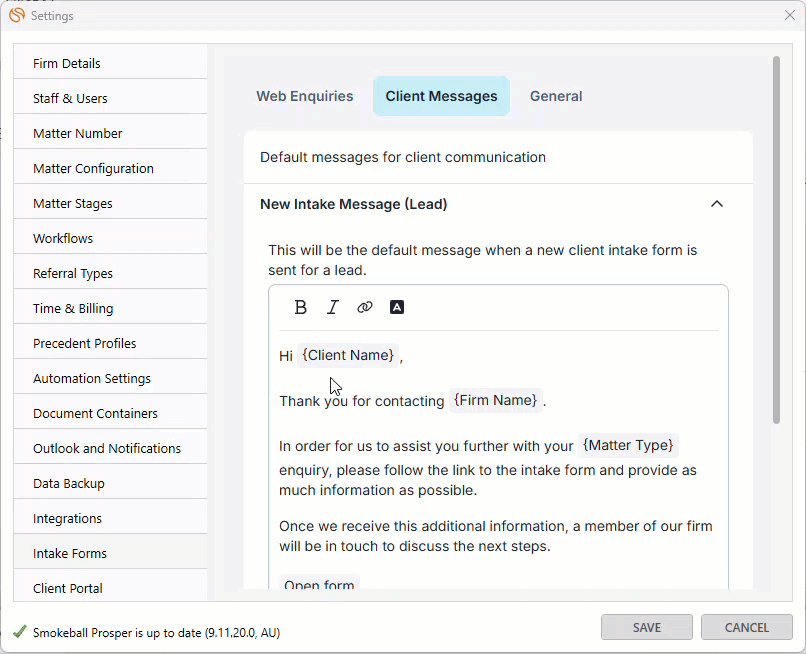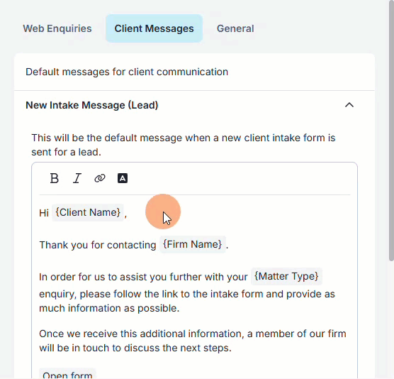 When sending Intake Forms to clients, you can customise the messaging when they interact with the form.
