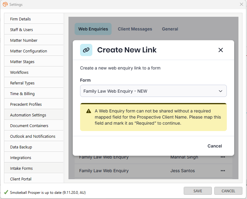 "A Web Enquiry form can not be shared without a required mapped field for the Prospective Client Name. Please map this field and mark it as “Required” to continue."