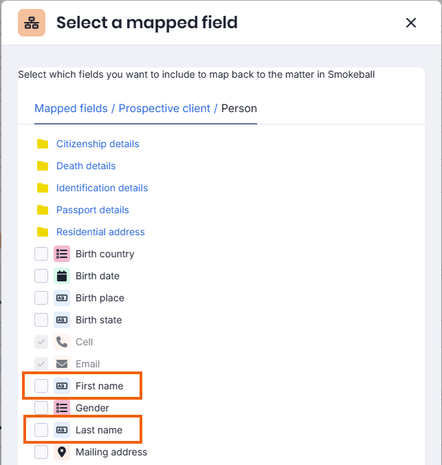 - Under Prospective Client > Person, ensure you have ticked either First Name or Last Name and select Update field.