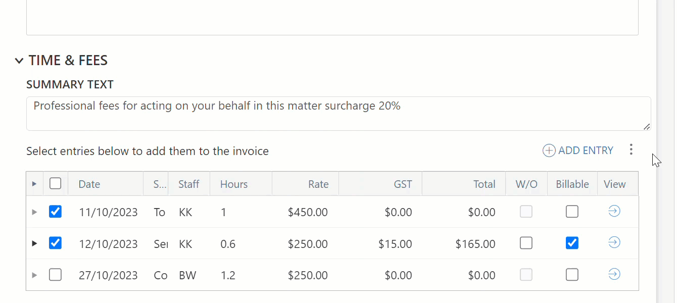 - Select the three dots icon above the list of time entries and click on Show non-billable fees on invoice.