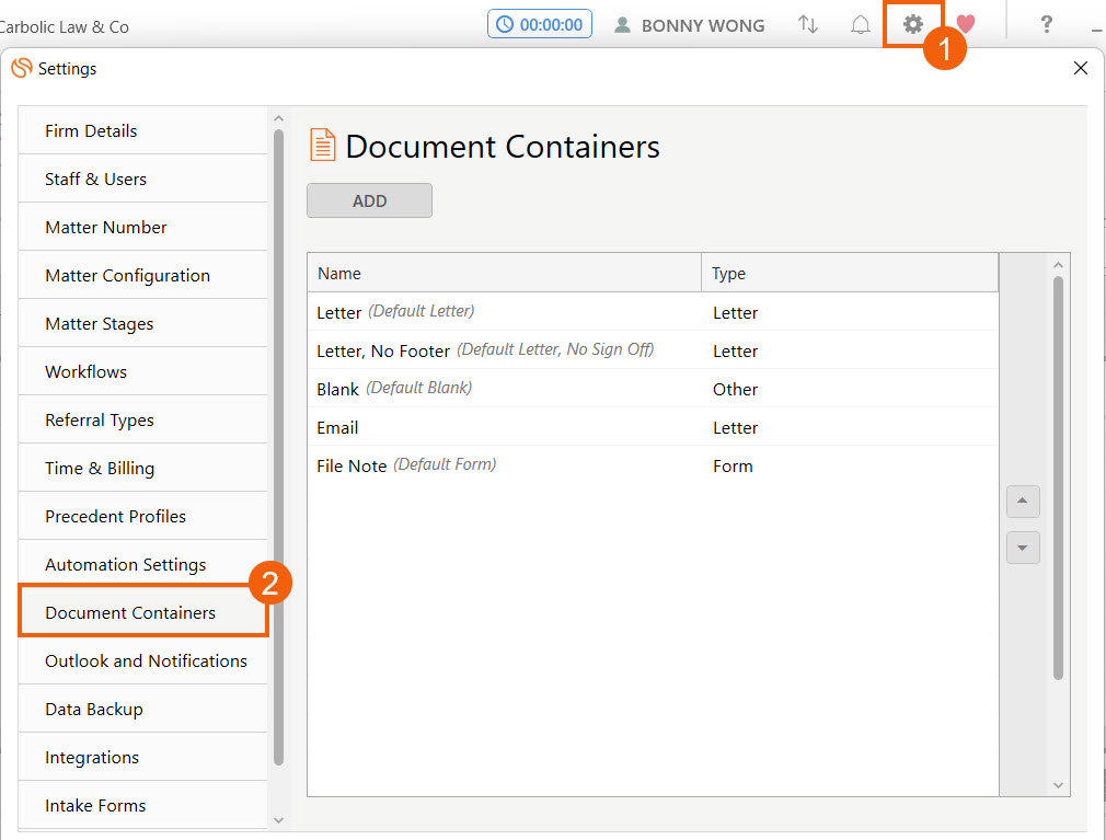 Document containers are where your firm's letterhead and letter structure are set up. They apply to all your letters, giving them a consistent and professional look.
