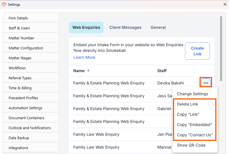 - Under the Web Enquiry tab, select the three dots icon next to the relevant lead Intake Form.