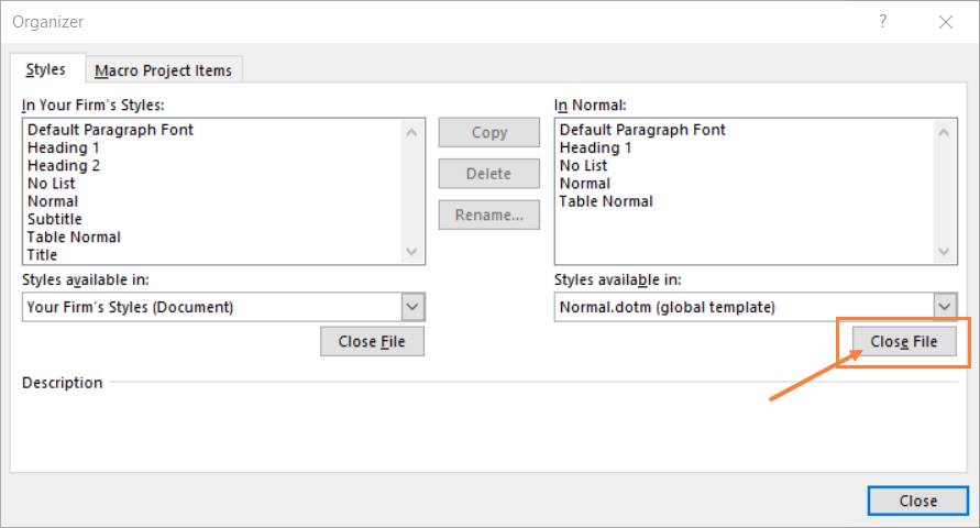 - The Organiser window will open, where you will copy the styles from your firm's document over to the document container file.Â
