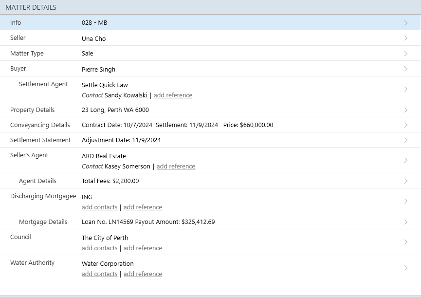 The Sale (WA) matter type provides the necessary contact cards and layouts for a sale of a Real Property transaction.