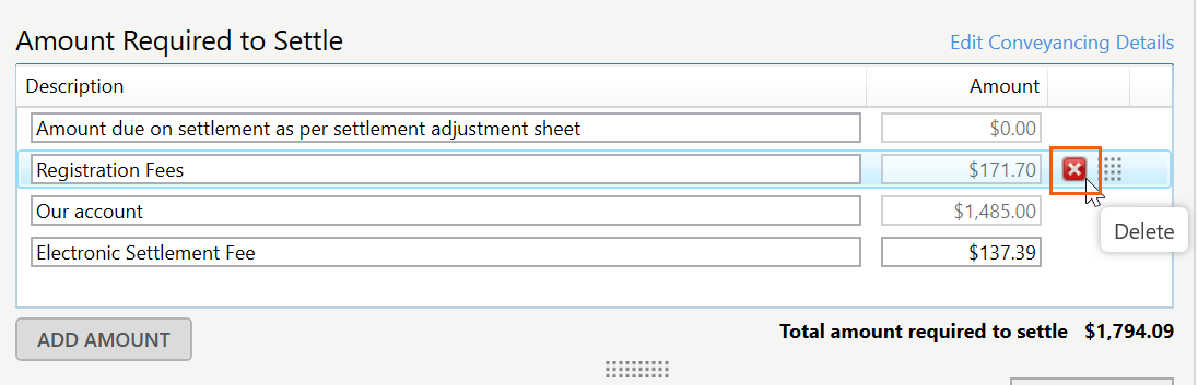 - Amount due on Settlement and Transfer/Stamp Duty (if applicable) amounts cannot be deleted. Stamp duty will only appear if the duty is unpaid and not exempt.