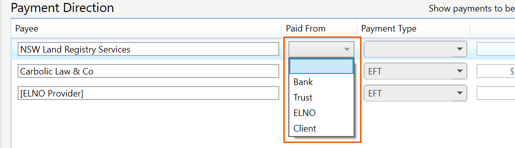 Based on what is selected in the Paid From column in the Payment Direction table, the system will calculate the total amount that is paid from Bank, Trust, ELNO and Client.