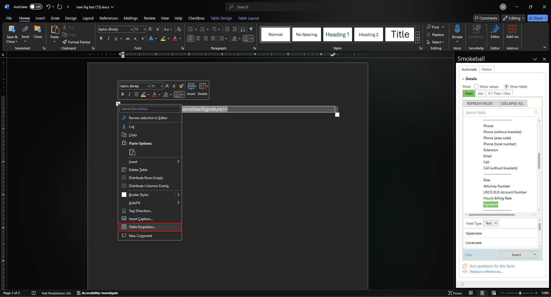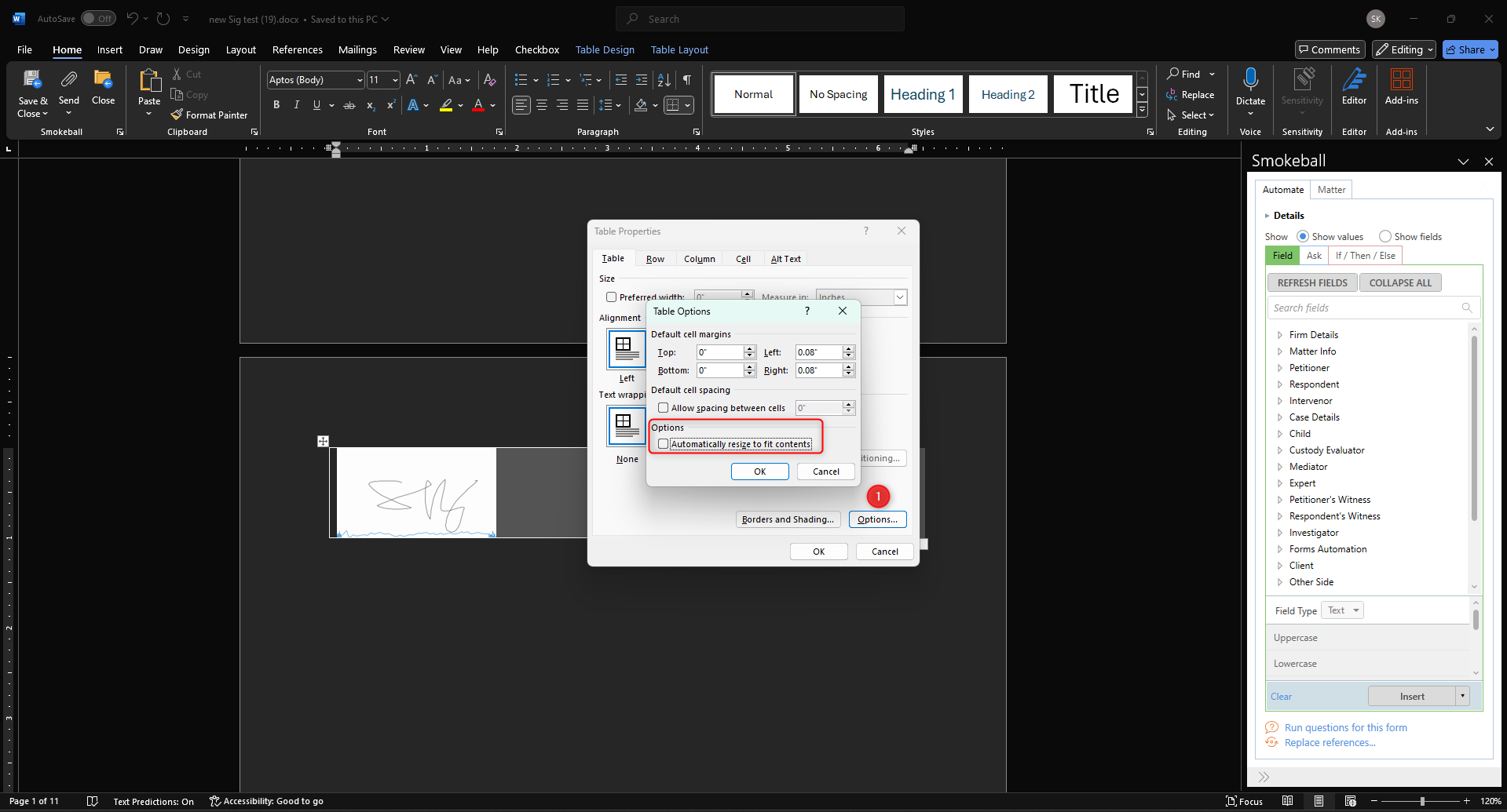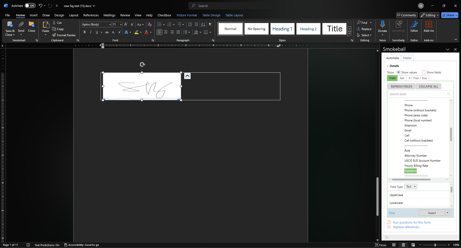- On the Smokeball toolbar, toggle Show Values and re-size the image until it is fully visible in the table.