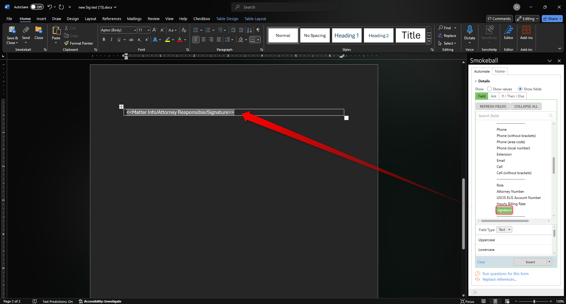 - Select Matter Info > Person Responsible or Person Assisting or Introducer > Signature from the automation panel.