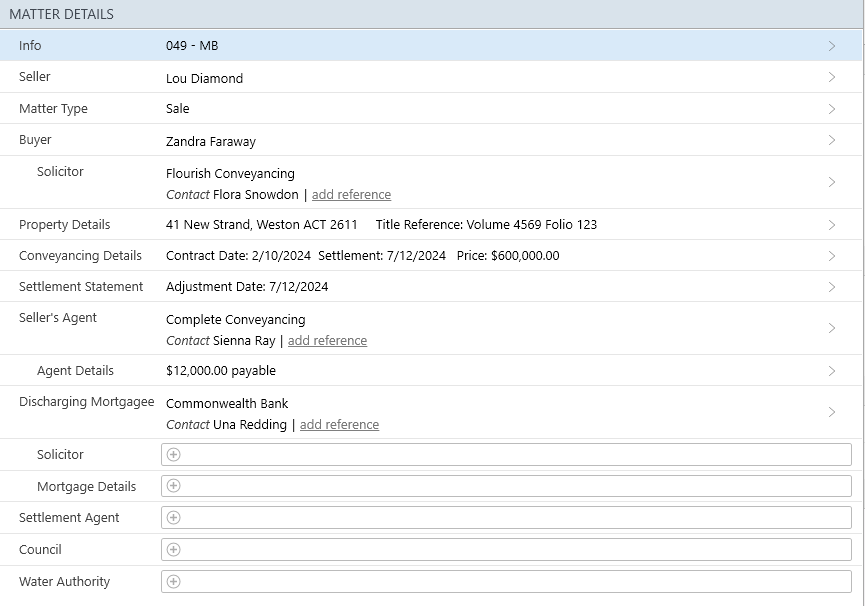 The Sale (ACT) matter type provides the necessary contact cards and layouts for a sale of a Real Property Transaction.
