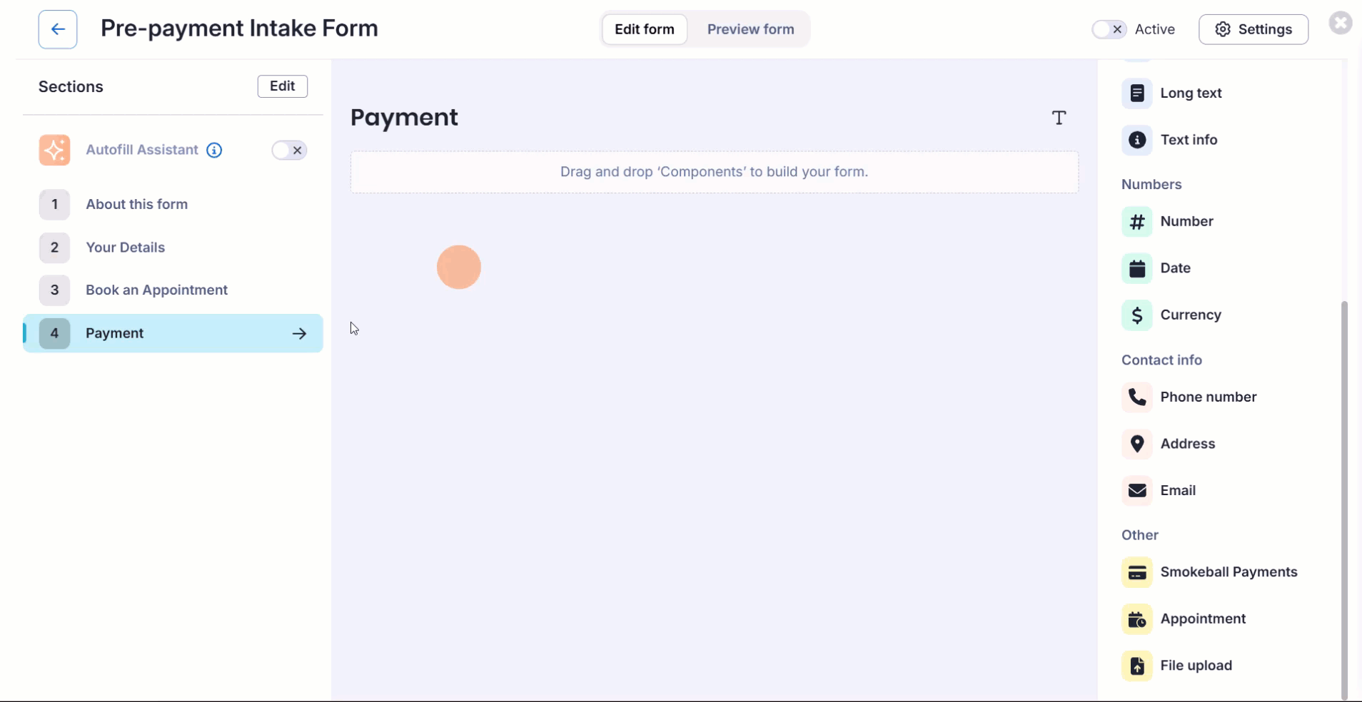 - Select the Payment section and drag and drop the Smokeball Payments component tile from the right side of your screen onto the box with the dotted line in the middle of your screen.