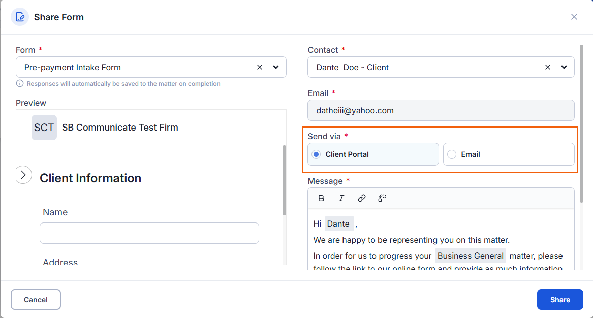 - Choose to send the form via the Client Portal or email.
