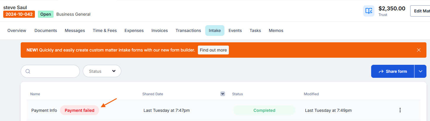 You can easily track your client's progress through their matter's Intake tab. This tab will also let you know if the transaction failed.