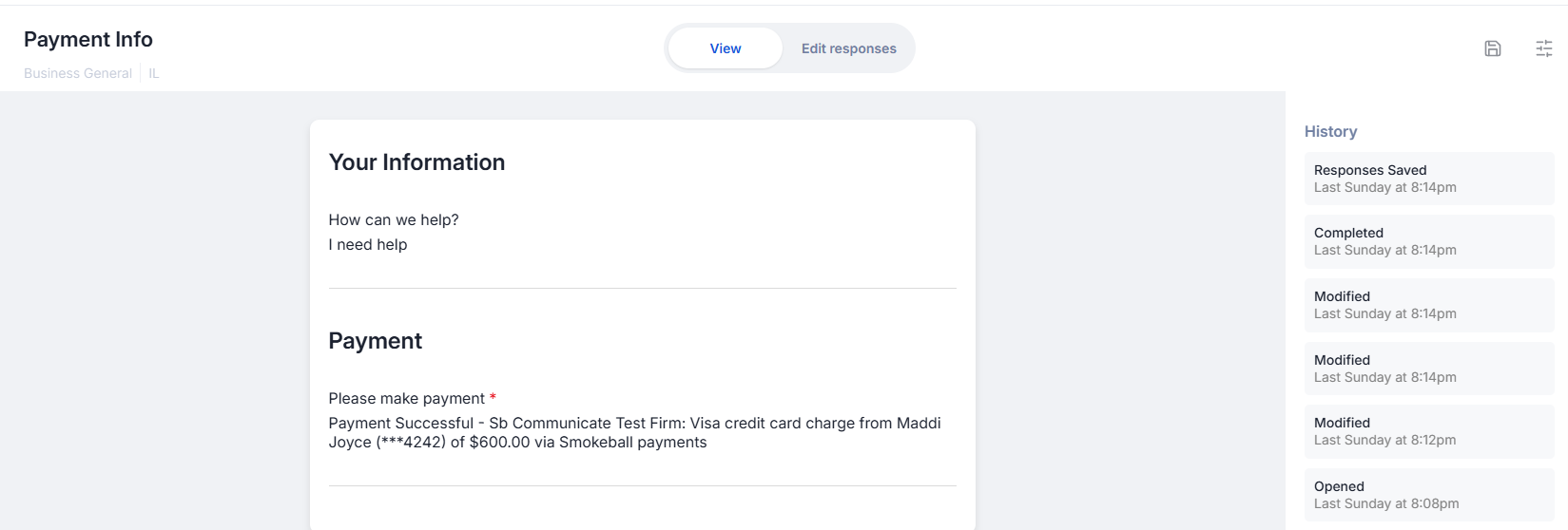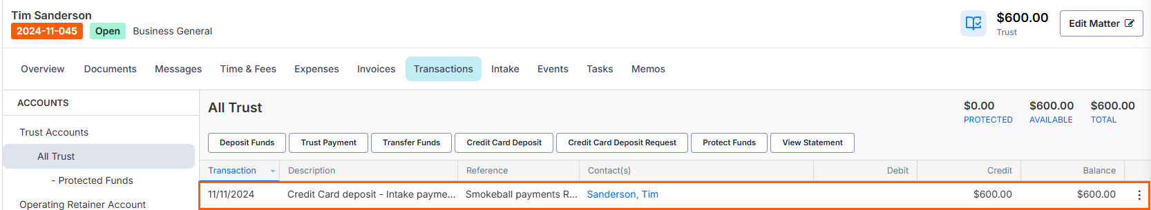- You can view a full record of the client's intake form payments on their matter's Transactions tab. The entry will note it is an intake payment under the Description column.Â