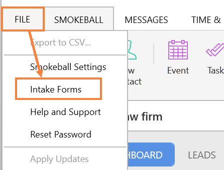 In the Smokeball Desktop App, select File from the top-left corner of Smokeball, then select Intake Forms.
