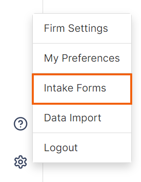 In the Smokeball Web App, select the Settings (gear) icon, then select Intake Forms.