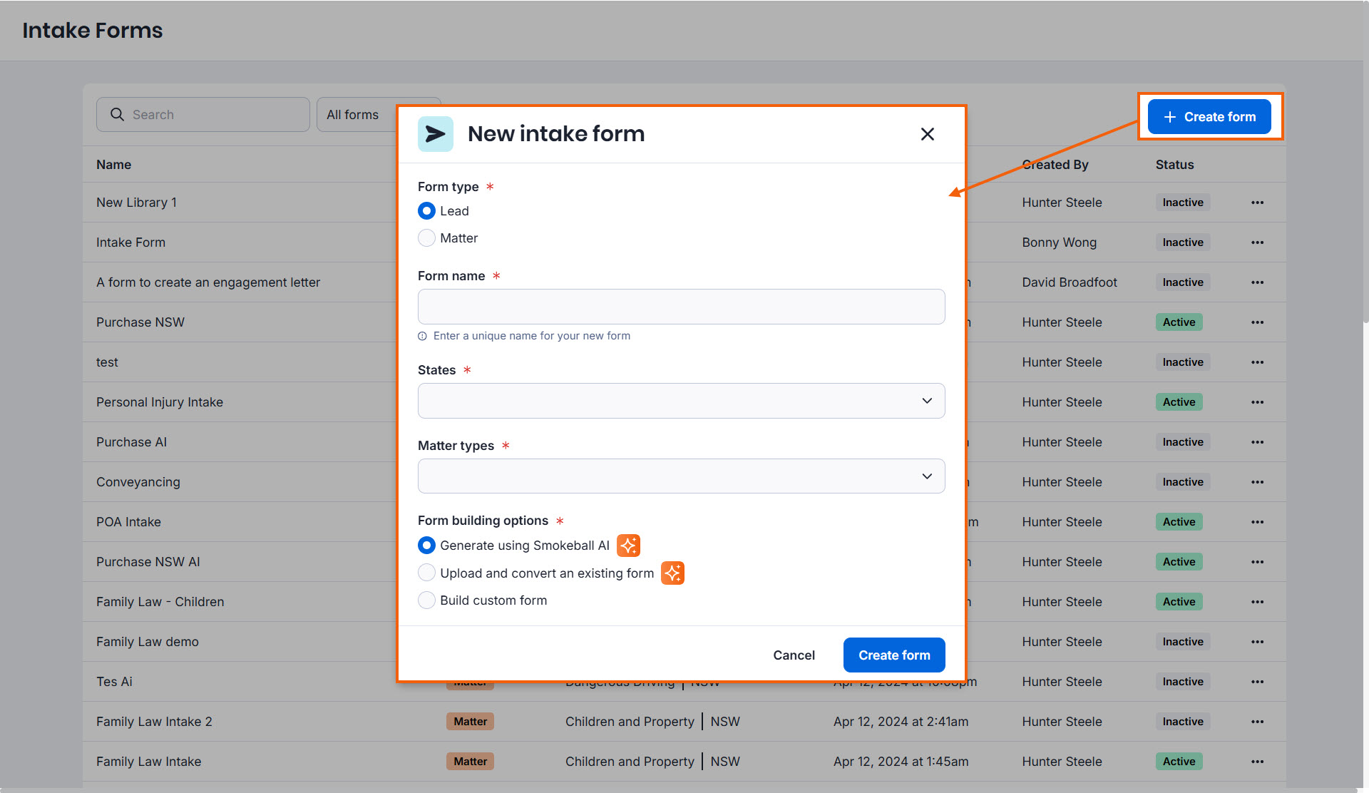 - Select Create Form and choose either Lead or Matter as a Form type.