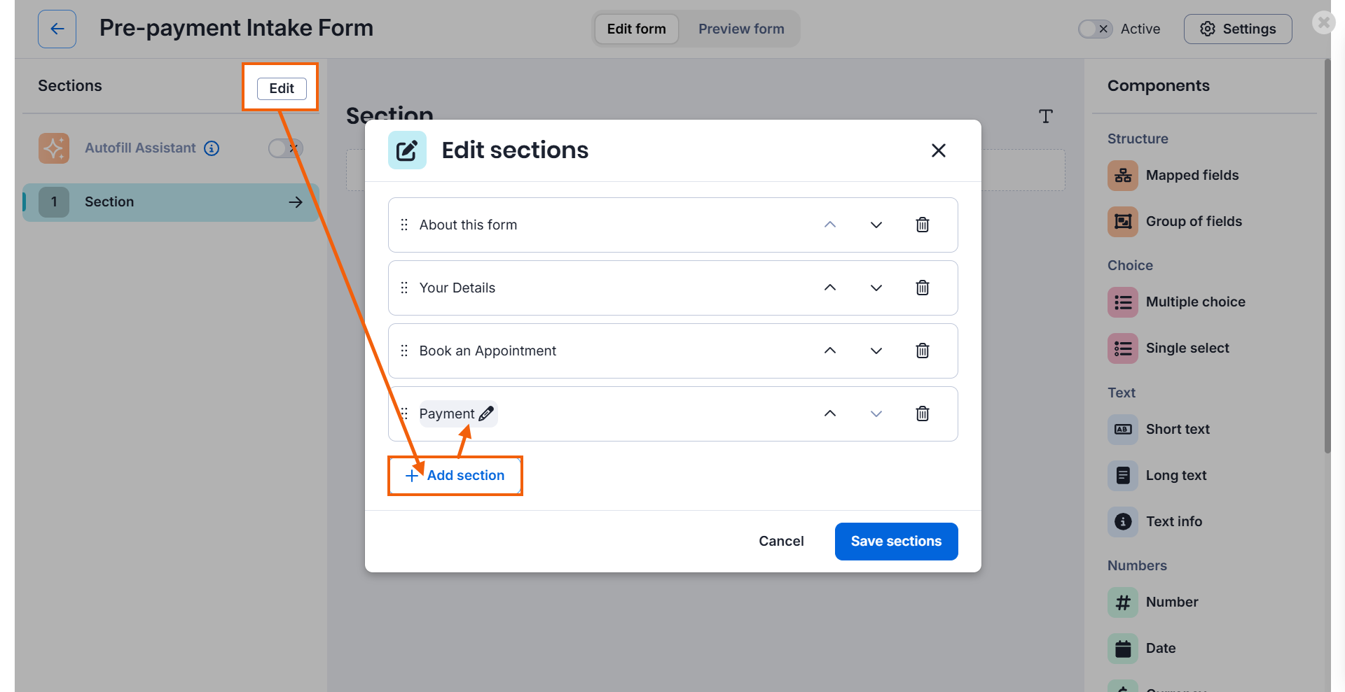 - Select the Edit button next to sections to add additional sections to the form.