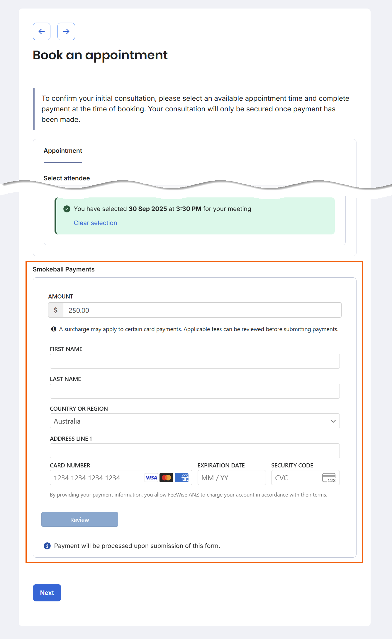Once you have signed up for Smokeball Payments, you can use it to receive trust or retainer payments as part of the intake process. One common use for this solution is to take pre-payment when your clients book a consultation through an intake form.Â