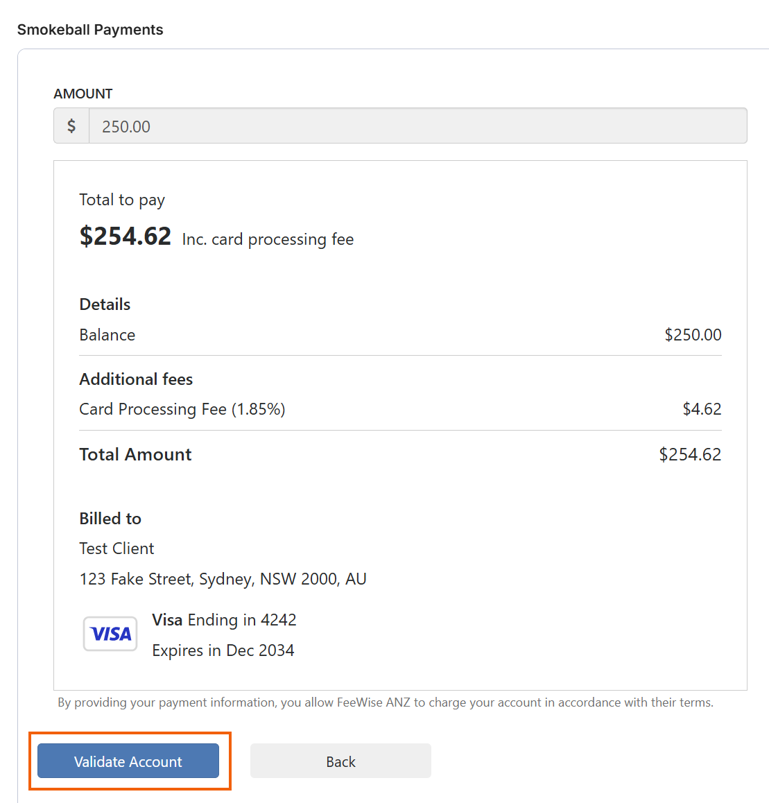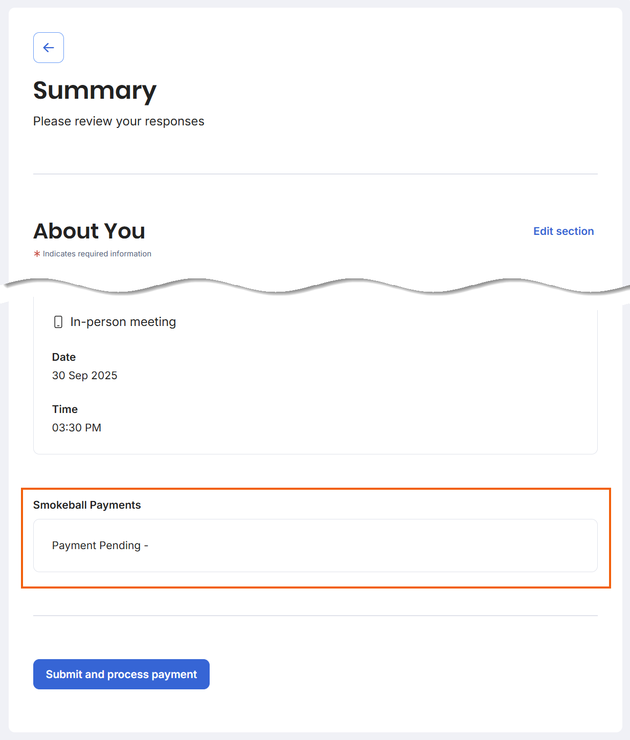 At the end of the form, the client can confirm all details on the Summary. They then need to select Submit and process payment to complete the intake and begin processing payment.