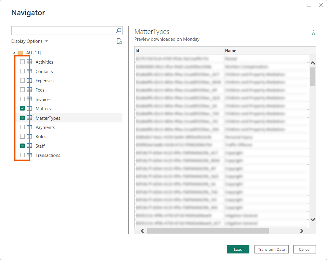 In the Navigator, tick the data points you wish to load. The Preview pane on the right-hand side will update with a sample of data from your Smokeball firm that you can analyse in Power BI.