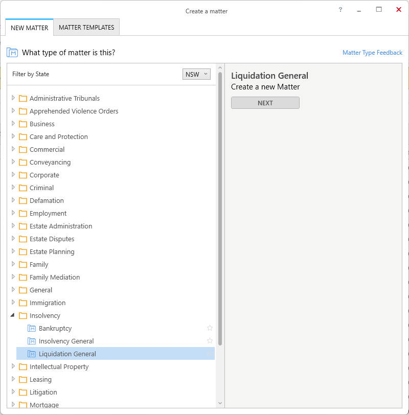 The Liquidation General (FED) matter type provides the necessary contact cards and layouts for the liquidation of a company by a Liquidator proceeding before the Federal Court.