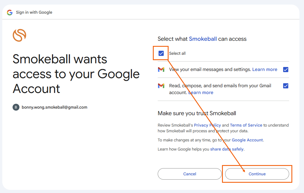 Tick Select all when prompted to choose what Google can access, then select Continue.