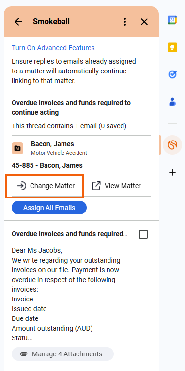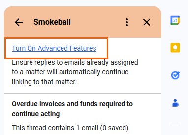 Select Turn on Advanced Features to enable Smokeball for Gmail to automatically save future replies and correspondence in emails to the assigned matter.Â