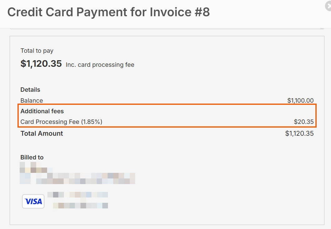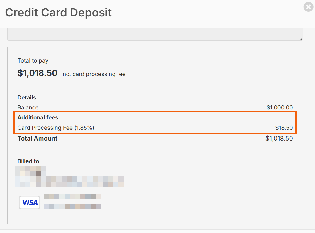 Request processing fee from client for invoice payments means the Smokeball Payments surcharge will be displayed and added to the total amount of a card payment on an invoice right before processing.