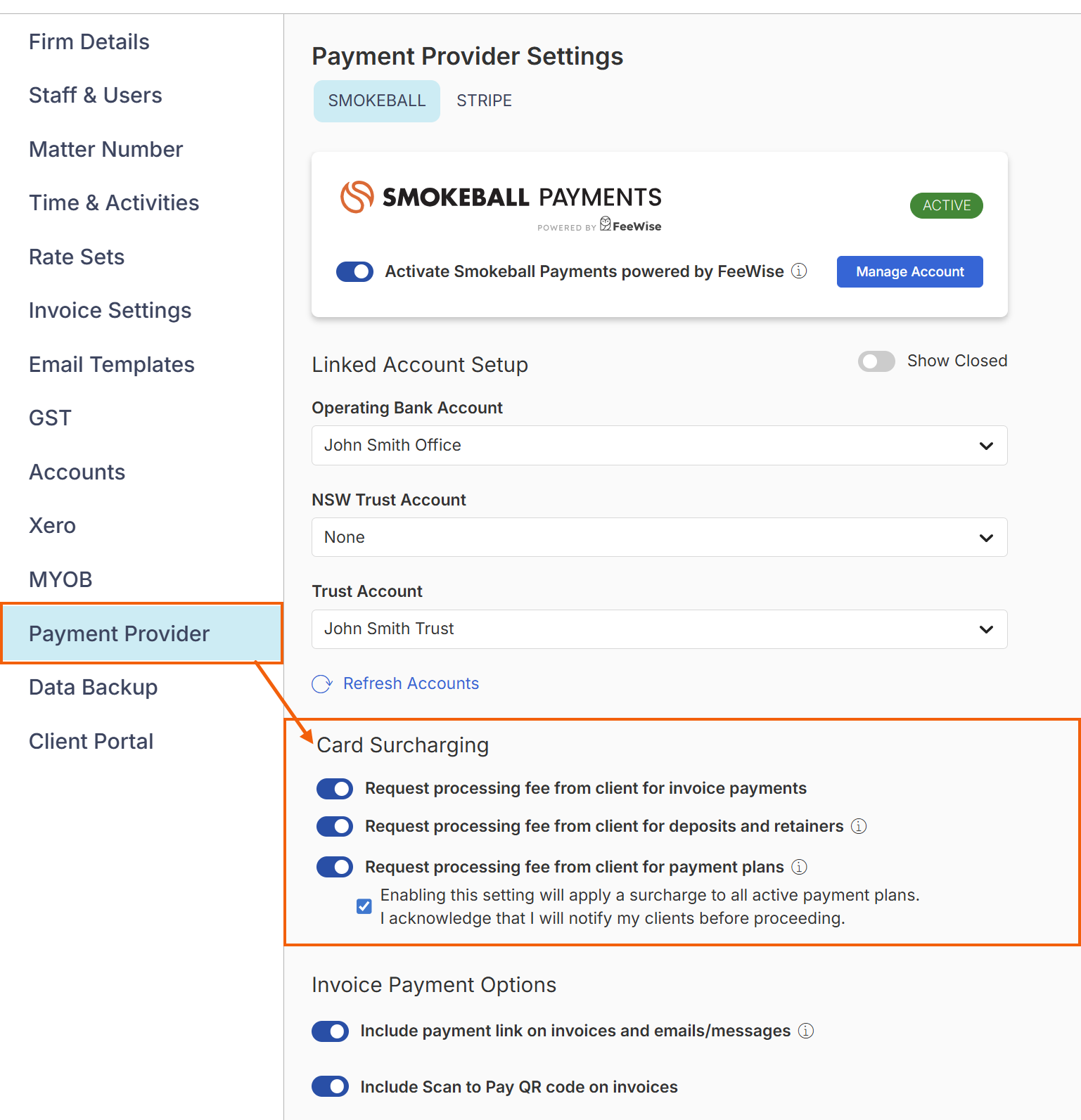 - Request processing fee from client for payment plans means the Smokeball Payments surcharge will be applied to each instalment on new and active payment plans you may have with your clients. As payment plan instalments are automatically deducted from the client's nominated credit card, you must ensure you have notified your clients of the surcharge before turning this on.