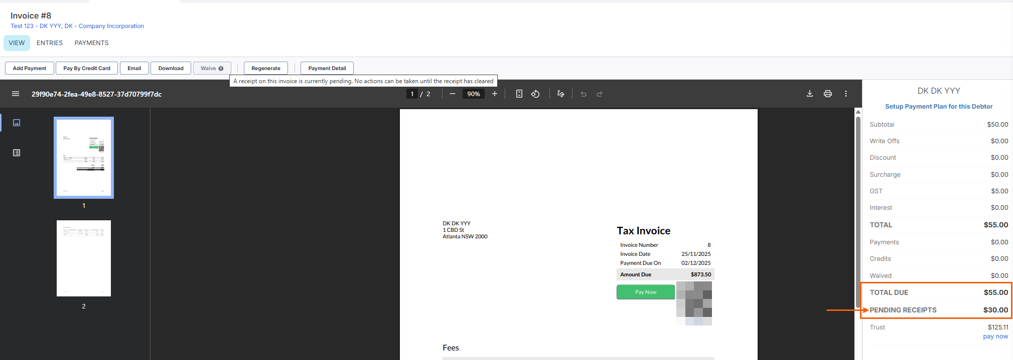 When there is a pending payment for a partial amount of the invoice, only the Waive button will be disabled, and the debtor can only pay the remaining balance of the invoice.