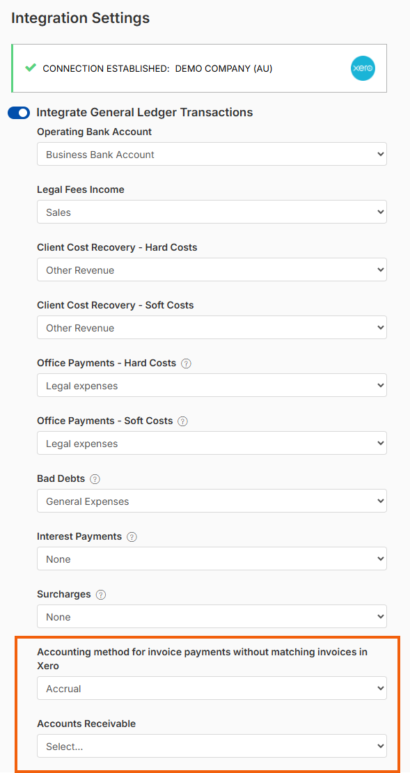 - You can now specify whether your firm uses Cash or Accrual accounting in Firm Settings > Xero. If Accrual is selected, a new drop-down menu will appear for you to map to an Accounts Receivable (Current Asset) account. Payments without a corresponding invoice in Xero will post as bank transactions being offset by the field mapped to this Accounts Receivable (Current Asset) field.