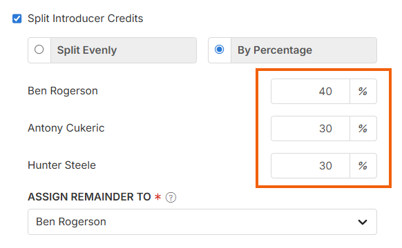 2. Choose whether credits should be Split Evenly or By Percentage. If you select By Percentage, enter the percentage amounts next to each listed Introducer. The total amounts must equal 100%.