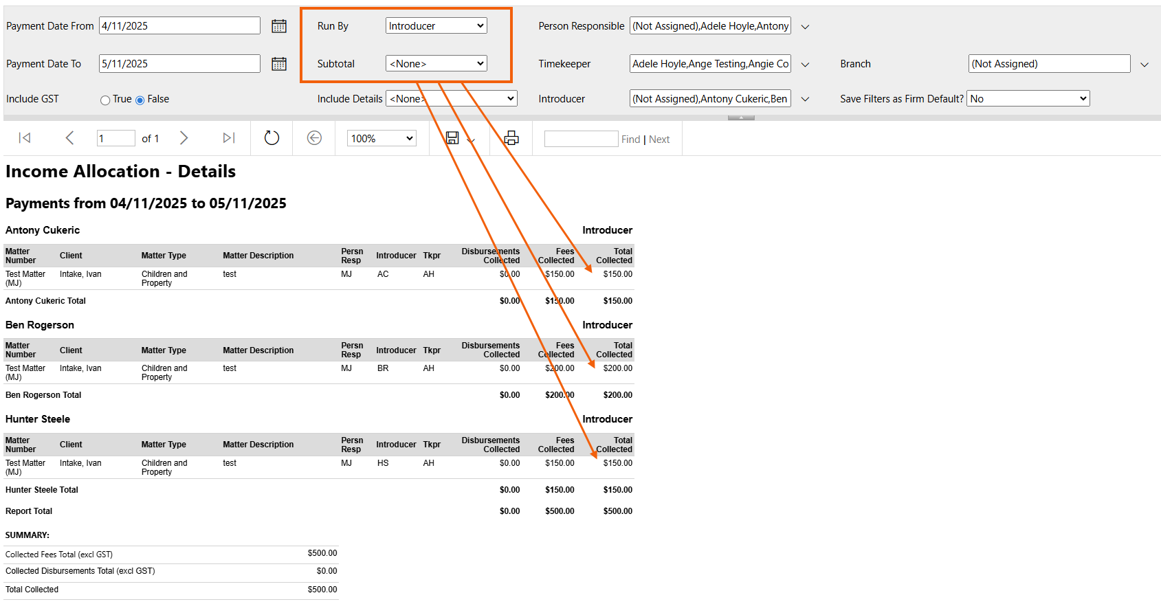 When Split Introducer Credits are enabled on a matter, payments that are applied to invoices on that matter will show the split on the Income Allocation - Summary and Income Allocation - Details report when Introducer is selected in the Run By or Subtotal filters.