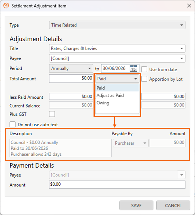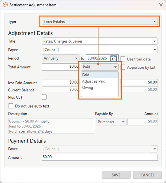 In this Quick Guide we summarise how each payment status (Paid, Adjusted as Paid and Unpaid/Owing) applies to a Time Related Adjustment Item, such as Council Rates or Water & Sewerage Rates.