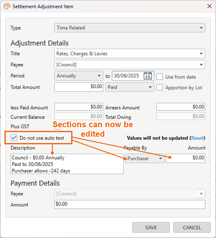To amend how your adjustment item appears in your document, you can select Do no use auto text to allow you to amend the Description, Payable By and Amount: