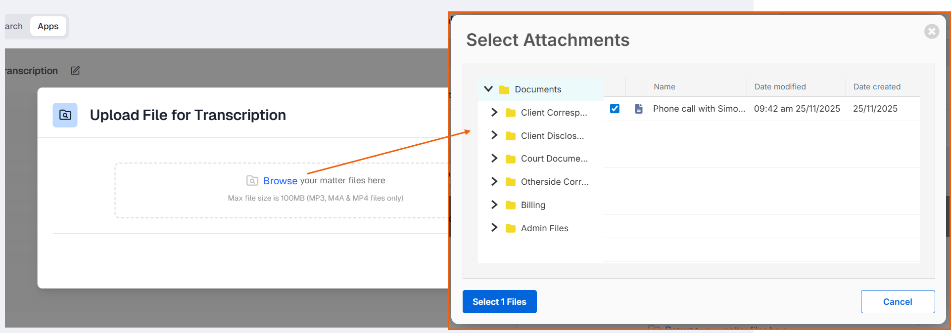 Select Browse and choose one audio or video file from your matter. Then click on Select 1 Files.