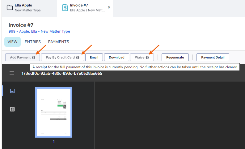 When there is a pending payment for the full amount of the invoice (i.e. it is within its clearance days period), the Add Payment, Pay By Credit Card and Waive buttons will be disabled.