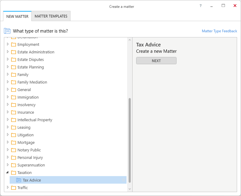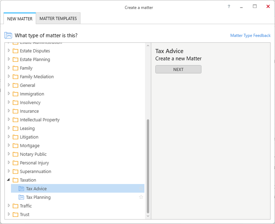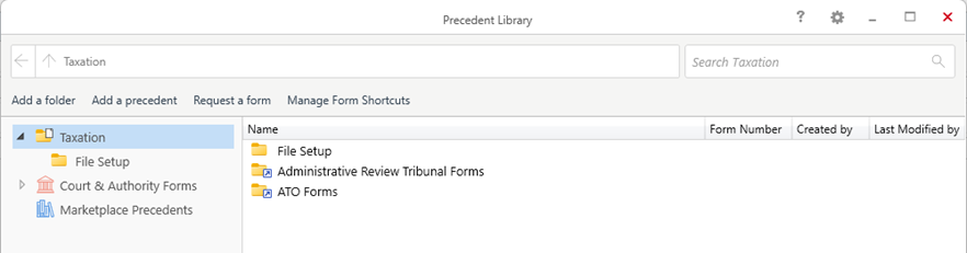 The Tax Advice (FED) matter provides access to the Taxation (FED) Precedent Profile with pre-set Precedent Library folders which include non-legally drafted precedents for everyday use, together with shortcuts to commonly used documents found under Court & Authority forms: