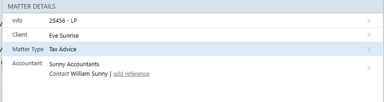 The following Contact Cards appear by default on a Tax Advice matter: