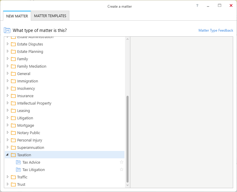 The following matter types are available in the Taxation matter category for each State and Territory: