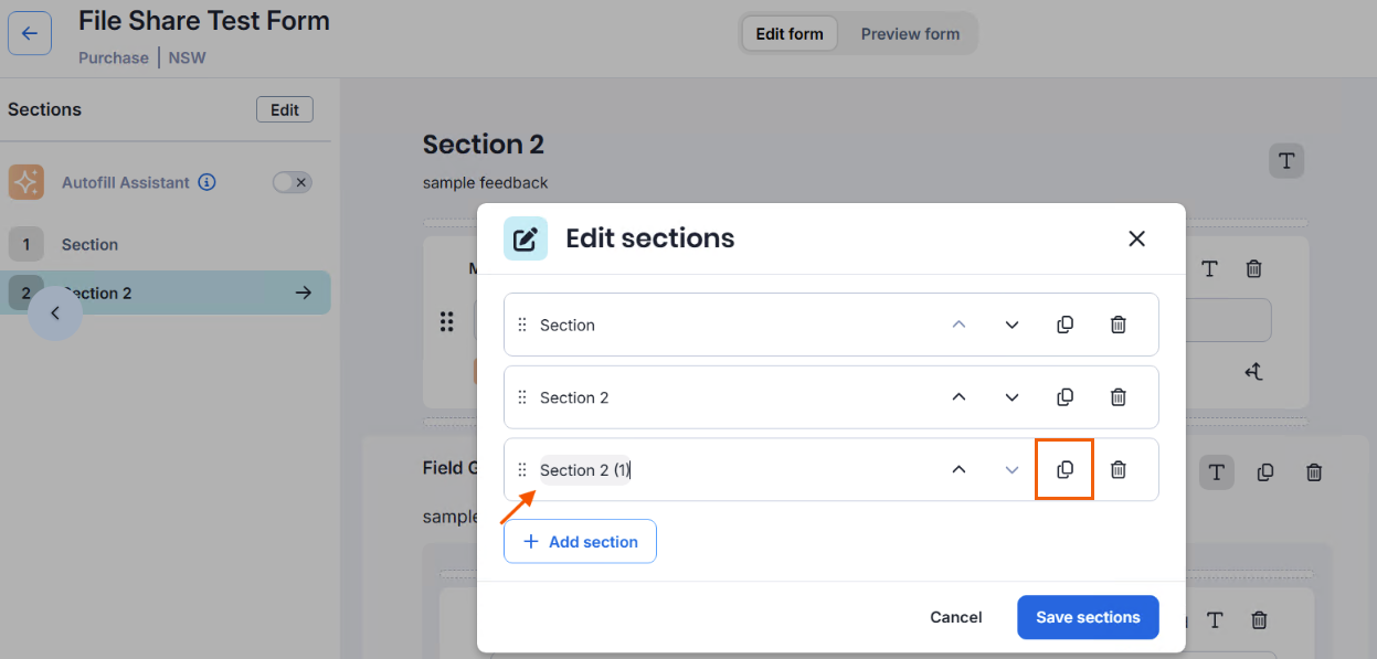 Copy a group and section in the Intake Form builder