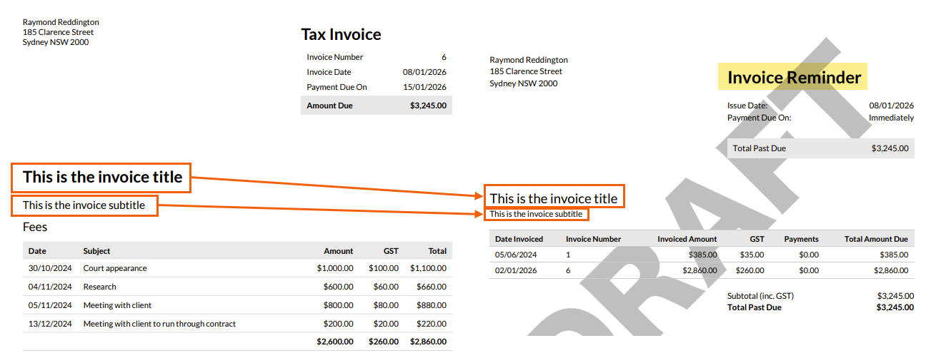 The title and subtitle on invoice reminders now match with the title and subtitle specified in the Invoice Settings of the matter, or the Invoice Template.