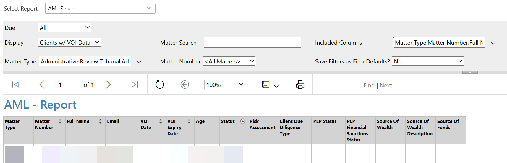 Final interface may be subject to change Final interface may be subject to change - The new AML Report allows you to run a report on clients with VOI data or clients without VOI data. The report columns include: