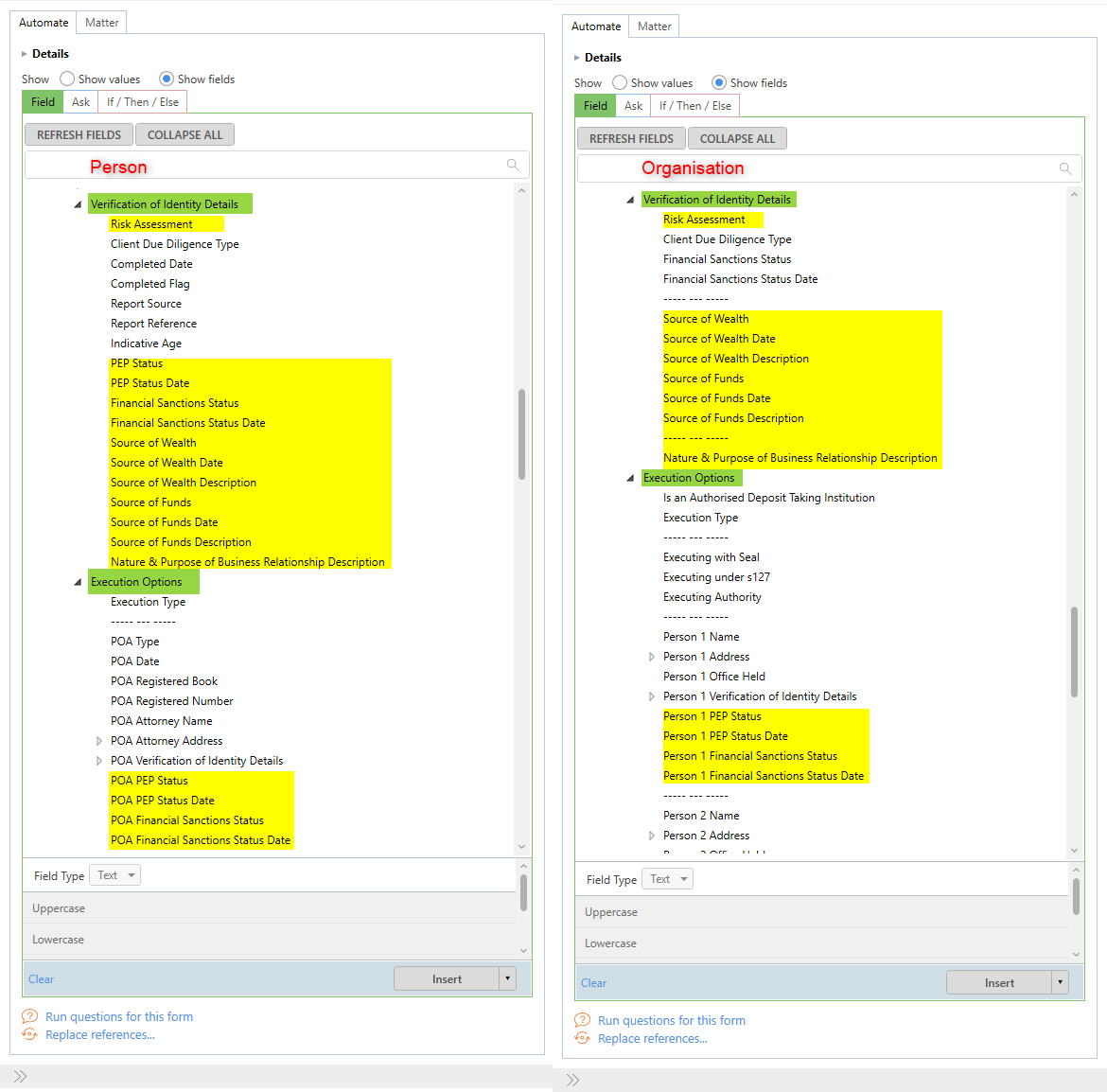 New AML fields are available for Person and Organisation type contact cards.Â
