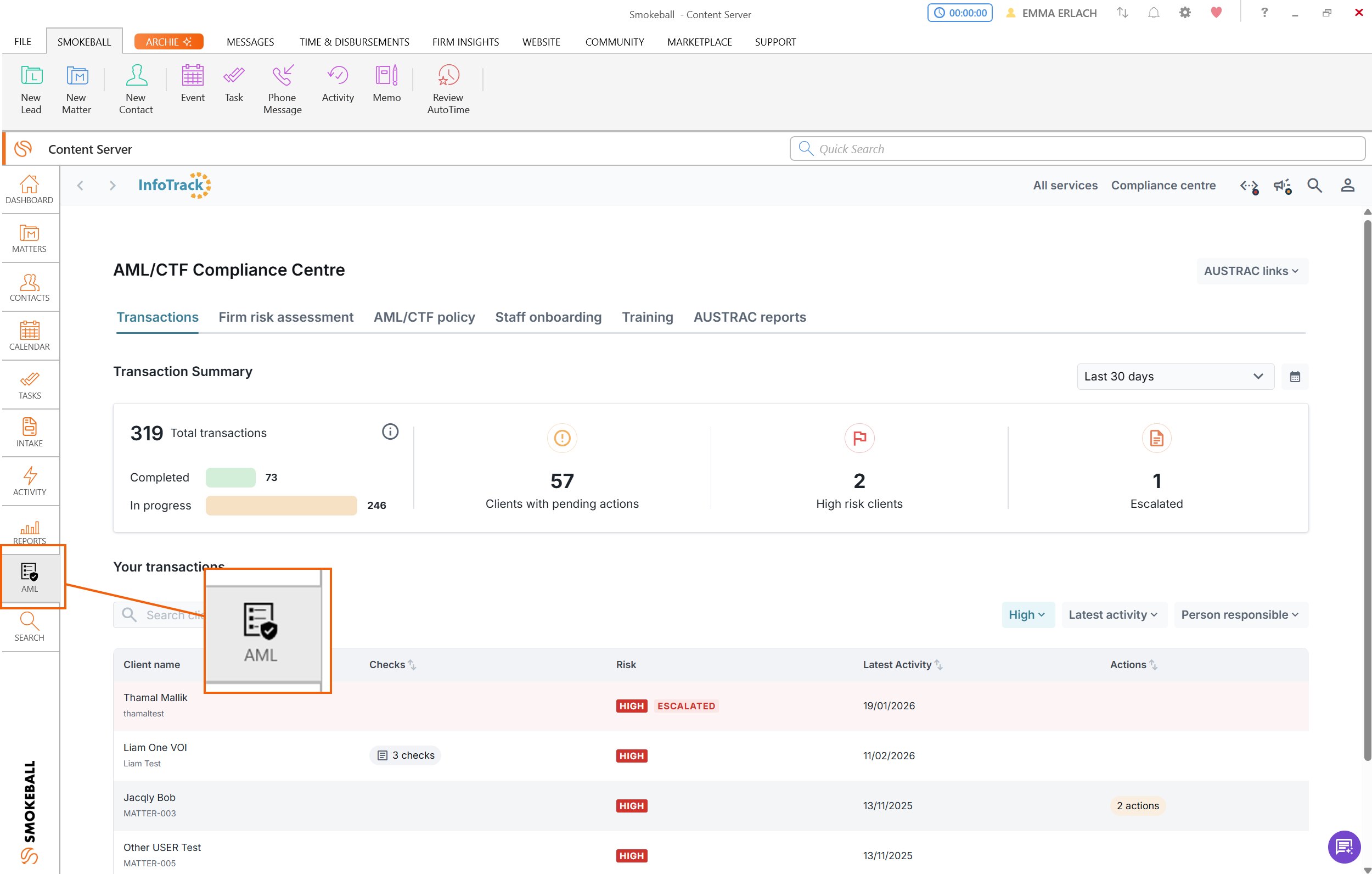 A new AML button has been added to the left-hand panel on the main Smokeball Desktop App window. This button opens the new InfoTrack Compliance Centre.